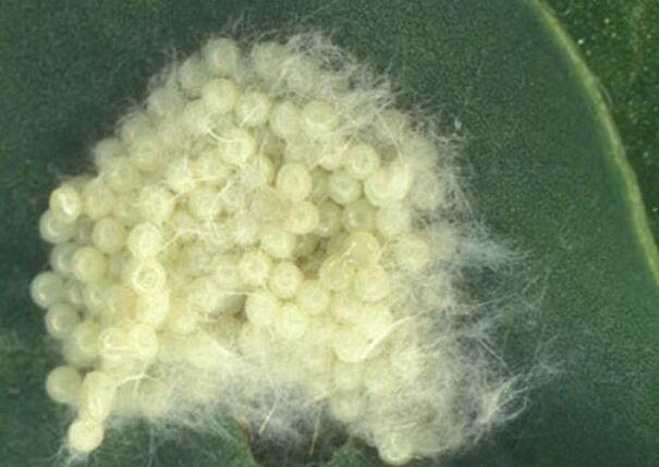 卵呈圆顶状半球形,直径约为4毫米,高约3毫米,卵块聚产在叶片表面,每卵块含卵100-300粒,有时成Z层。卵块表面有雌虫腹部灰色绒毛状的分泌物覆盖形成的带状保护层。刚产下的卵呈绿灰色,12小时后转为棕色,孵化前则接近黑色,环境适宜时卵四天后即可孵化。雌虫通常在叶片的下表面产卵,族群稠密时则会产卵于植物的任何部位。在夏季,卵阶段的持续时间仅为2-3天。